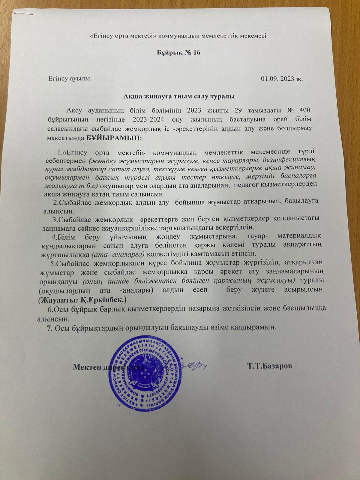 2023 -2024 жаңа оқу жылының басталуына орай білім саласындағы сыбайлас жемқорлық іс- әрекеттерінің алдын- алу және болдырмау мақсатында Жетісу облысы, Ақсу ауданының білім бөлімінің 2023 жылғы 29 тамыздағы № 400 бұйрығын негізге ала отырып "Егінсу орта мектебі" коммуналдық мемлекеттік мекемесінің 2023 жылдың 1 қыркүйектегі № 16 бұйрығы шықты. Бұйрық мектеп ұжымына тыныстырылды.